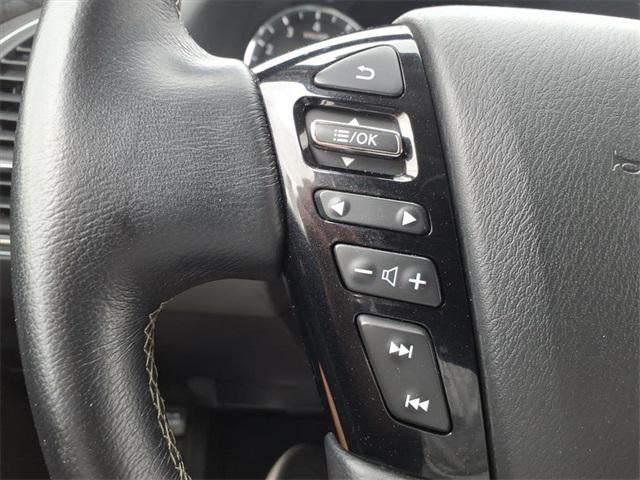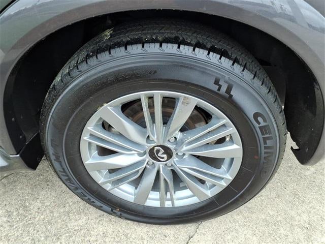 13 Speakers, 2.937 Axle Ratio, 20 Aluminum Alloy Wheels, 3rd row seats: bench, 4-Wheel Disc Brakes, ABS brakes, Air Conditioning, Alloy wheels, AM/FM radio: SiriusXM, Anti-whiplash front head restraints, Apple CarPlay/Android Auto, Auto High-beam Headlights, Auto tilt-away steering wheel, Auto-dimming door mirrors, Auto-dimming Rear-View mirror, Auto-leveling suspension, Automatic temperature control, Brake assist, Bumpers: body-color, Compass, Delay-off headlights, Driver door bin, Driver vanity mirror, Dual front impact airbags, Dual front side impact airbags, Electronic Stability Control, Emergency communication system: INFINITI InTouch, Four wheel independent suspension, Front anti-roll bar, Front Bucket Seats, Front Center Armrest, Front dual zone A/C, Front fog lights, Front reading lights, Fully automatic headlights, Garage door transmitter: HomeLink, Heated door mirrors, Heated Front Bucket Seats, Heated front seats, Heated steering wheel, Illuminated entry, Leather Shift Knob, Leather steering wheel, Leather-Appointed Seats, Literature Kit, Low tire pressure warning, Memory seat, Navigation system: INFINITI InTouch Navigation, Occupant sensing airbag, Outside temperature display, Overhead airbag, Overhead console, Panic alarm, Passenger door bin, Passenger vanity mirror, Power door mirrors, Power driver seat, Power Liftgate, Power moonroof, Power passenger seat, Power steering, Power windows, Radio data system, Radio: Bose Premium Audio System w/13 Speakers, Rain sensing wipers, Rear air conditioning, Rear anti-roll bar, Rear reading lights, Rear seat center armrest, Rear window defroster, Rear window wiper, Reclining 3rd row seat, Remote keyless entry, Security system, Speed control, Speed-sensing steering, Split folding rear seat, Spoiler, Steering wheel memory, Steering wheel mounted audio controls, Tachometer, Telescoping steering wheel, Tilt steering wheel, Traction control, Trip computer, Turn signal indicator mirrors, Variably intermittent wipers, Voltmeter.
